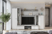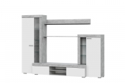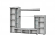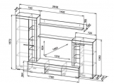 Тумба гостиной имеет два отсека для хранения с откидными створками по краям и открытую нишу со стационарной полкой посередине. Откидные створки не комплектуются ручками и удерживающими системами. Открываются за выступающий к центру торец и при открывании укладываются на пол. По краям изделия располагаются пеналы с глухой створкой и стеклостворкой высотой 1872 мм и 1260 мм. Пенал высотой 1872 мм, в секции с глухой створкой комплектуется двумя стационарными и одной съемной полками, в секции со стеклостворкой тремя полками из стекла толщиной 4 мм. Соответственно пенал высотой 1260 мм комплектуется двумя стационарными полками в секции с глухой створкой и двумя стеклянными полками в секции со стеклостворкой. Навесная полка представляет собой две детали из ЛДСП «Цемент светлый» соединенных под прямым углом евровинтами. Полка крепится к стене на навесы-проушины. Разметка для установки навесов на деталях делается самостоятельно при сборке. Крепеж в стену подбирается покупателем самостоятельно, исходя из материала стен.