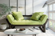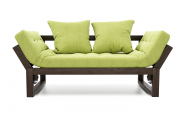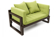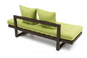 Каркас изделия выполнен из натурального и экологически чистого массива сосны. Матрас крепится к реечному основанию каркаса специальными крепежными лентами. Надежная и простая конструкция может превратить удобную кушетку в запасное место для сна. Трансформация осуществляется за счет изменения положения подлокотников. У данной модели есть три вариации каждого подлокотника: вертикально вверх, под углом и в горизонтальном положении. На кушетке могут сидеть два взрослых человека, вес каждого до 140 кг. Сидеть на разложенном подлокотнике не рекоменДуэтся, это может привести к поломке изделия. В полулежачем положении подлокотники служат опорой для ног. Чехол не съемный.